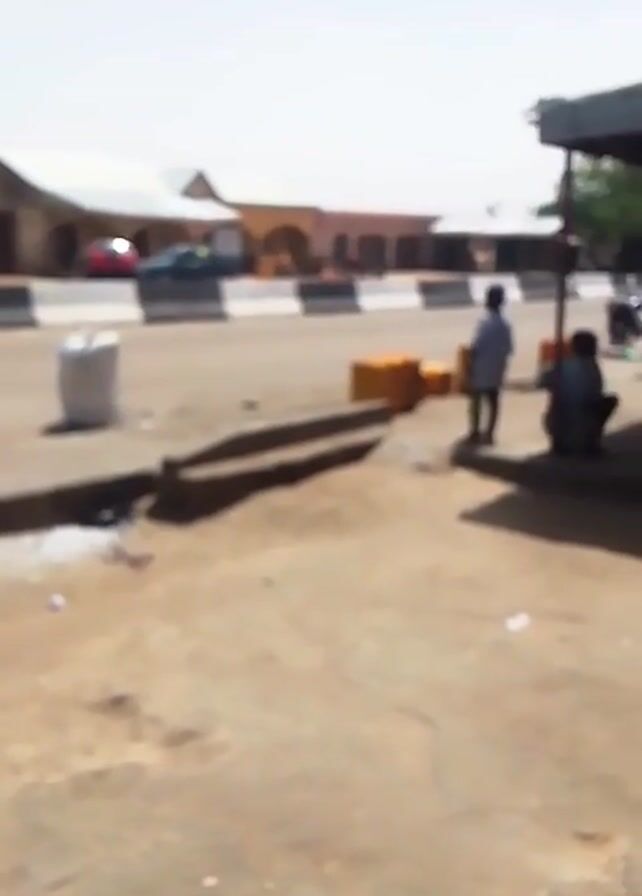 The video depicts an outdoor scene in a moderately sunny environment. In the foreground, the ground appears sandy and dusty. Moving towards the middle ground, there is a street with black and white striped barriers. A white sack-like object is visible on the left side of the street. On the right side, there are several orange objects and a man standing in a light-colored shirt. Further to the right, another individual is sitting under a shaded structure. A motorcycle is parked nearby. In the background, there are buildings with arch-shaped entrances. The focus is somewhat blurry throughout the video.