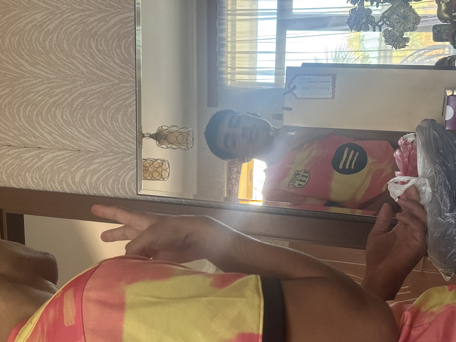 The image depicts an indoor scene in Bulishi, Georgia. A male individual is present, with his back partially to the camera, engaged in taking a mirror selfie. He wears a pink and yellow tie-dye patterned short-sleeved shirt, identified by a Barcelona crest and a Spotify logo visible in his reflection. His left hand is raised, forming a "V" gesture with his index and middle fingers. In the foreground, his right hand is positioned over a clear plastic bag containing a red object, resting on a dark surface. The rectangular mirror reflects the individual's face, which is looking directly towards the mirror/camera. Also reflected are two ornate, cylindrical, gold-toned ceiling light fixtures, and a brightly illuminated window featuring white sheer curtains. Beyond the window, green foliage is visible. On the surface below the mirror, a cream-colored gift bag with a red-edged tag, a partially visible purple box, a metallic decorative item resembling flowers, and a smartphone are present. The wall adjacent to the mirror is covered in light-toned wallpaper adorned with a repetitive, stylized feather pattern.