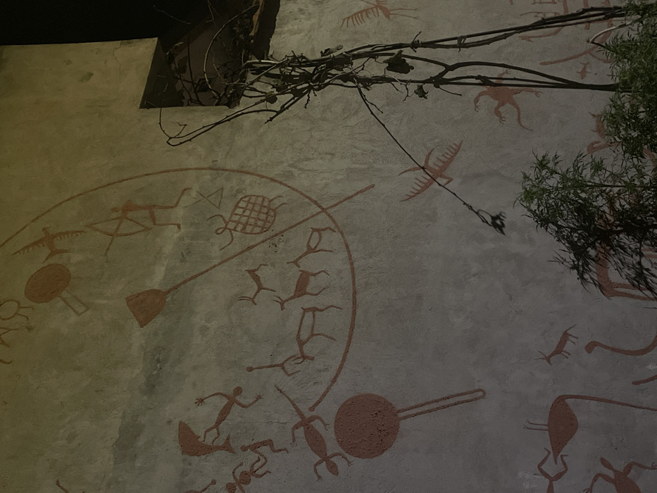A rough wall surface is adorned with reddish-brown drawings reminiscent of ancient rock art