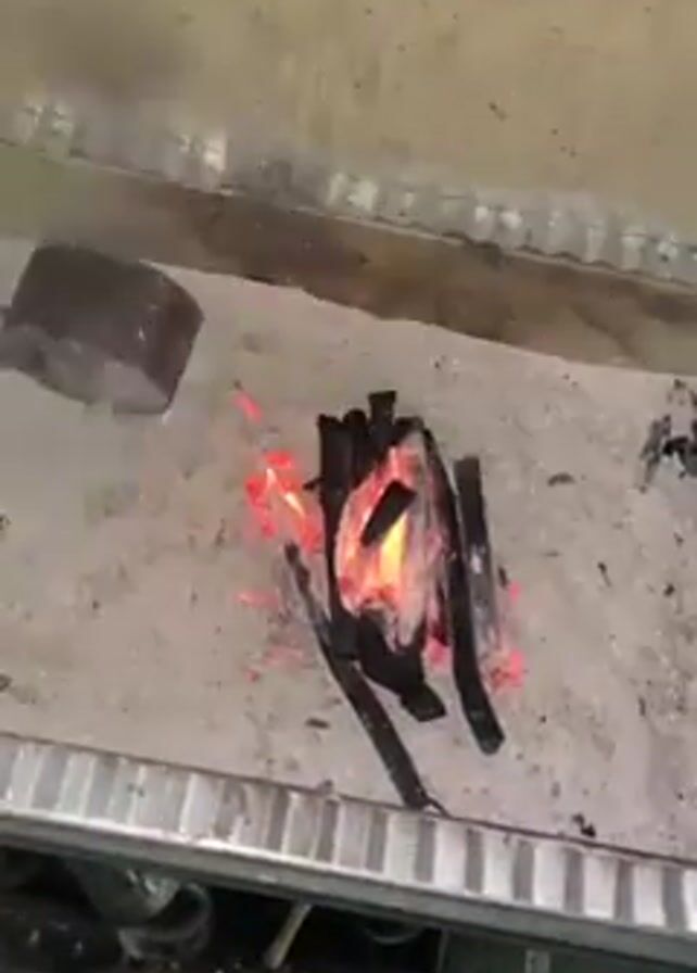 A small fire burns with glowing embers, set on a concrete or tiled surface with a corrugated metal edge
