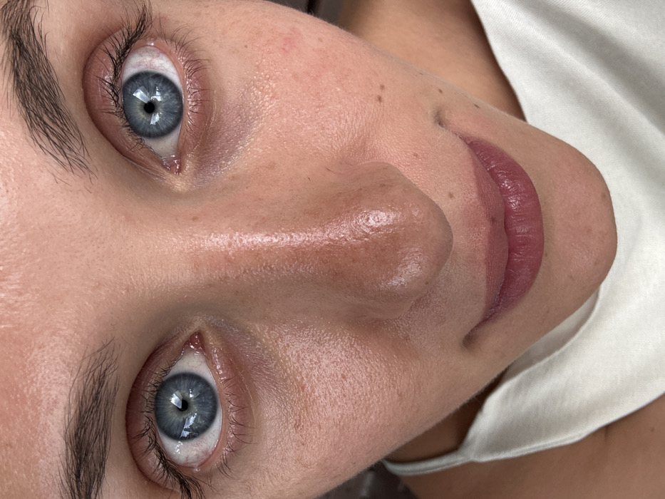 A close-up, high-angle portrait depicts the face of a female subject in Choeng Thale, Thailand. Her wide-open blue eyes are directed towards the camera, with distinct dark pupils reflecting a visible light source. Dark eyebrows frame the eyes, and eyelashes are present. The skin on her face, including the forehead, nose, and cheeks, exhibits a glossy sheen, consistent with natural oils or hydration. Visible skin texture, pores, and sparse small freckles are discernible. Her lips are closed, displaying a subtle upward curve indicative of a slight smile, and are colored with a matte pinkish-mauve shade. A portion of a light-colored, possibly white, garment is visible along the lower left and bottom edges of the frame.