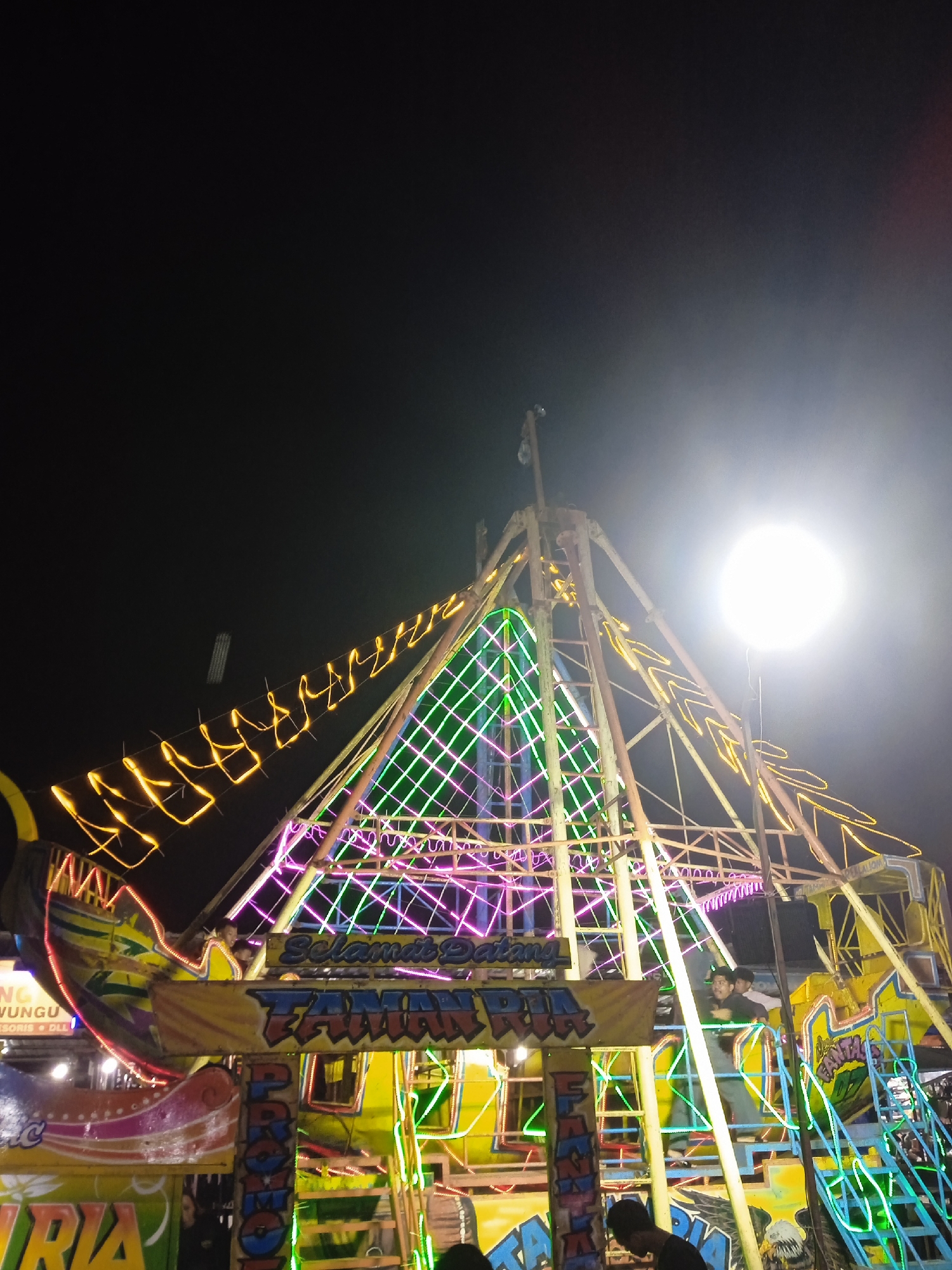 The image depicts a brightly lit Ferris wheel at night in Kaliwungu, Indonesia. The wheel is illuminated with a variety of colored lights, including yellow, green, and pink. People are visible both riding on and standing near the base of the ride. Various signs and decorations adorn the base of the wheel. The sky is dark, punctuated by a bright light source positioned near the top of the Ferris wheel.