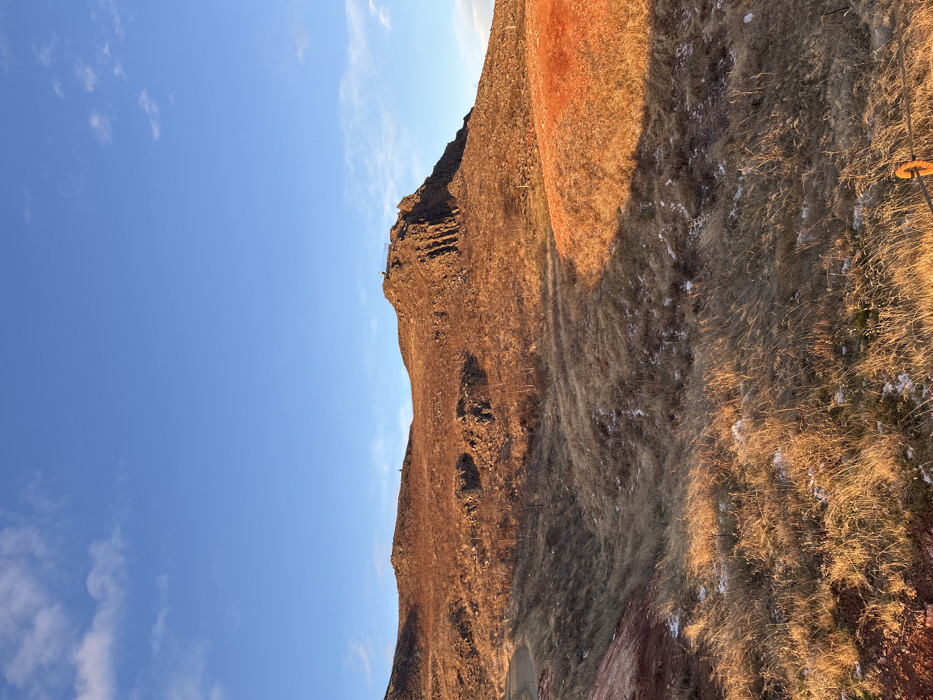 The image depicts a vast, rugged landscape under a clear, bright blue sky with sparse white clouds. The location is an unnamed area in Iceland. The terrain consists primarily of rolling hills and a prominent peak, composed of reddish-brown earth and rock formations. The ground is largely covered in dry, golden-brown grasses, with scattered patches of white snow or frost, particularly in the foreground and the bottom of a shallow valley in the mid-left. Sunlight bathes the scene in warm, golden light, creating long shadows and highlighting textural details. On the highest peak to the right, an elevated dark structure, likely a viewing platform, is visible, hosting two small, dark human figures. Another solitary human figure is discernible on a lower hill to the left of the prominent peak. Sparse, leafless dark trees or shrubs are scattered across the slopes. In the lower right corner, a dark cable or rope runs horizontally, secured by a bright orange C-shaped metal clip or ring. A dirt path is faintly visible winding up the hill on the far left. No direct interactions between the distant figures are observable.