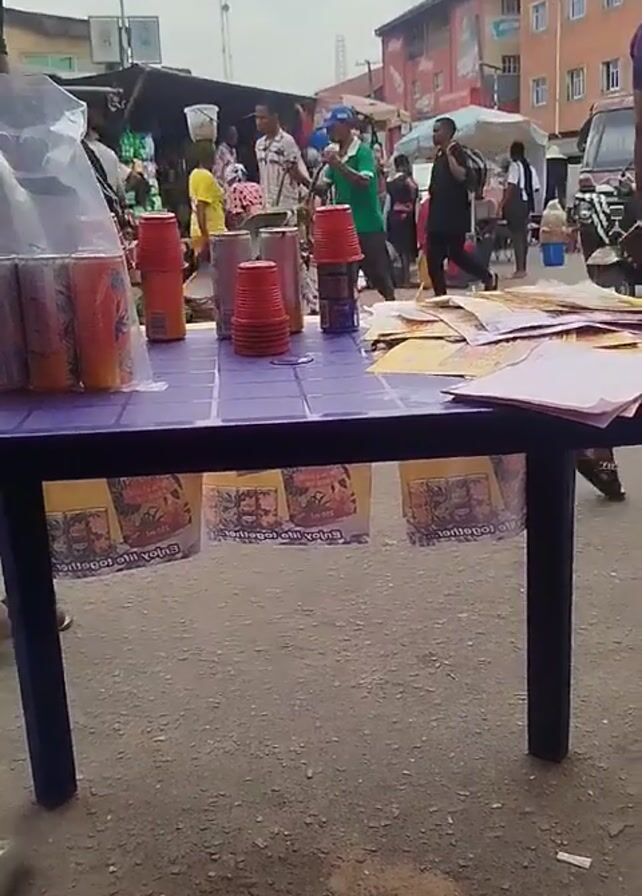 The camera shows a table set up in a crowded outdoor area that looks like a market. A man stands beside the table, facing away. On the table are stacks of red plastic cups, cans of soda wrapped in plastic, and a pile of yellow paper. The table is decorated with promotional materials hanging down on each side. Underneath the table, someone is wearing flip-flops. People are walking by in the background, and there are buildings and vehicles nearby.