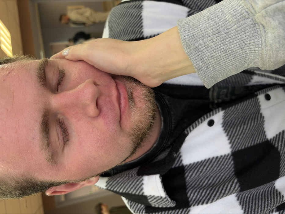 The scene depicts a close-up of a Caucasian male with eyes closed, situated indoors in Vereshchagino, Russia. The male has short brown hair and light-colored stubble on his chin and jawline. His facial skin, particularly on the cheeks and nose, exhibits a reddish tint. He wears a black and white plaid flannel shirt over a dark t-shirt with an indistinct graphic. A slender hand, with a visible light-colored painted thumbnail, rests against the right side of the male's face, cupping his cheek and jaw. The forearm associated with the hand is covered by a grey, ribbed cuff. The background is out of focus, revealing rectangular yellow-orange ceiling lights and light-colored walls. On the left, a blurry figure is partially visible. On the right, two additional blurred figures are discernible, one appearing to wear a light-colored garment. The environment appears to be a public or commercial interior.