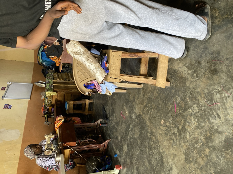 An indoor shot shows a woman in a headscarf operating a vintage sewing machine. Fabric and spools of thread are visible around her. A person in grey sweatpants and sandals sits on a wooden stool nearby. A plastic chair is piled with colorful fabric. A white board hangs on a wall with striped paint. The floor is concrete with scattered bits of string.