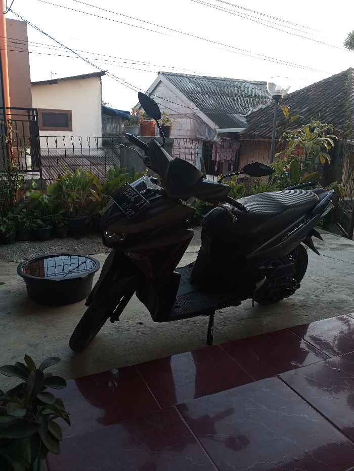 The image depicts a static outdoor scene in a residential area of Ciherang, Indonesia, under bright, possibly morning or late afternoon, sunlight. The primary subject is a dark-colored automatic scooter, possibly black or dark grey, parked on its kickstand on a light grey concrete surface. The scooter's license plate, visible on the front fender, reads "D 5244 XT" with "01.27" below. It features a textured black seat and rearview mirrors. To the immediate left of the scooter's front wheel, a black plastic basin or tub containing water is positioned on the concrete. In the bottom left foreground, a small potted plant with dark green leaves is visible on a reddish-brown tiled patio. This tiled area extends into the bottom right foreground, exhibiting reflections. Behind the scooter and basin, a line of potted plants creates a low barrier. Beyond these plants, a metal fence separates the immediate foreground from a cluster of residential buildings. On the left, a portion of a building with a brown wall and a dark-framed window is visible. In the center-right background, a white-painted building with a corrugated metal roof features clothes drying on a line. To its right, another building with a traditional tiled roof is partially visible. A street lamp with a clear, globe-shaped diffuser stands between the central and right buildings. Overhead utility lines crisscross the clear, bright sky. No people are present in the scene.