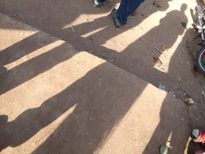 A ground-level shot features shadows of people and objects cast across a textured surface, possibly a dirt or concrete path