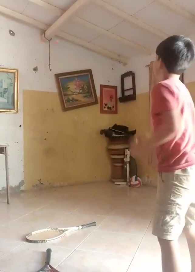 A boy in a red shirt and khaki shorts stands barefoot in a room with a tiled floor. He tosses a tennis ball in the air, hits it, and bends down to pick it up. Two tennis rackets lie on the floor. The room has light-yellow walls with several framed pictures. The ceiling is white with exposed beams. A table, a small shelving unit, and a curtained window can be seen in the background.