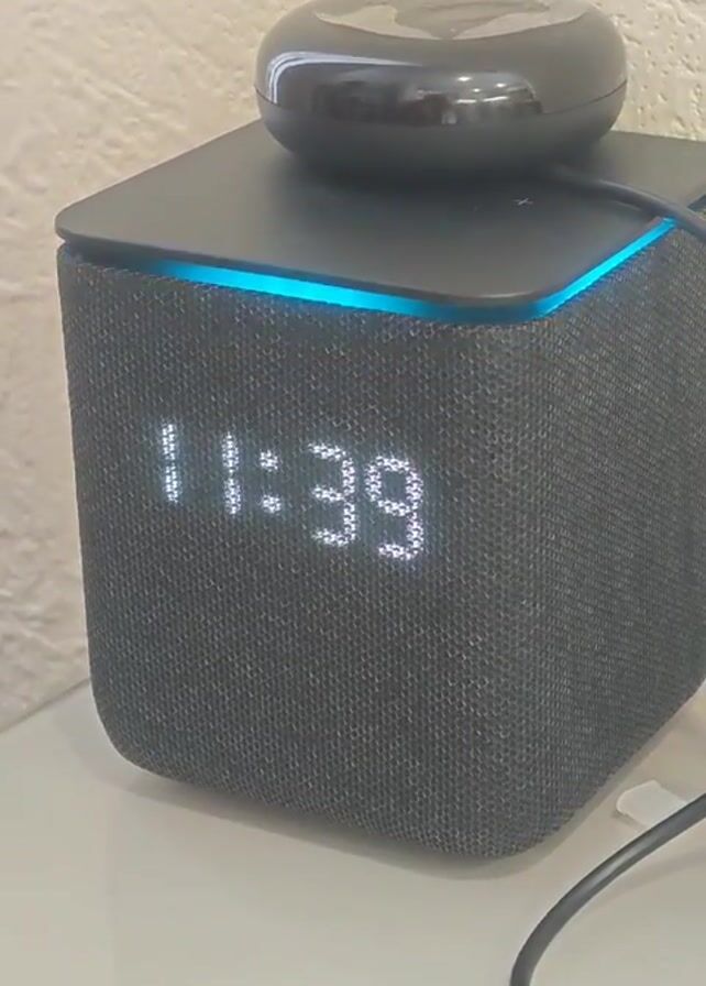 close-up of a black smart speaker. It displays a digital clock reading 11:39. The speaker has a fabric cover. There is a black, circular smart home hub device resting on top. The top edge of the speaker glows with a blue light that transitions to purple as the video progresses. A power cord is visible, plugged into the speaker. The speaker sits on a white surface against a textured, light-colored wall.