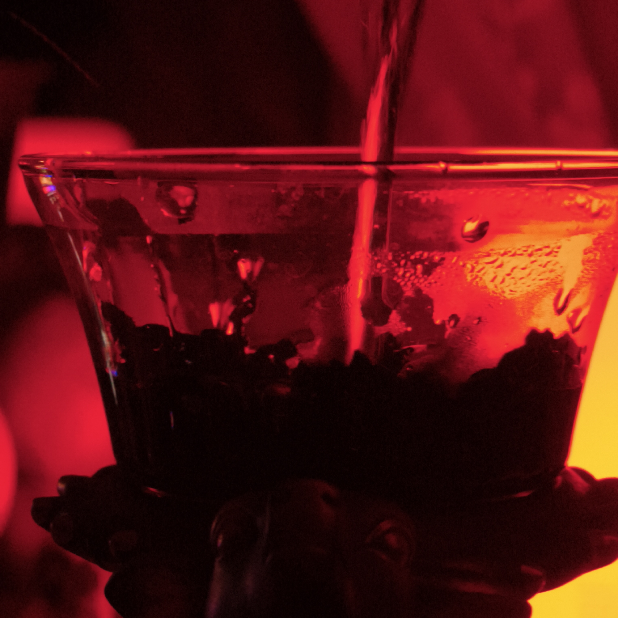 In a dimly lit environment, possibly Парэчча, Belarus, a clear glass bowl filled with dark objects is being filled with liquid. The bowl is supported by what appears to be a dark, sculptural base or set of hands. The dominant lighting is a strong red, with some yellow hues present in the background.