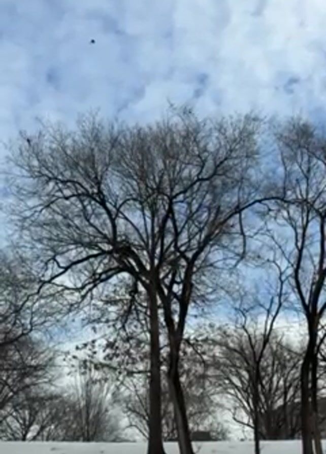winter landscape with bare trees covered in snow. The sky is light blue with patches of white clouds, and several birds are flying in the sky. The ground is covered in snow, and there are more bare trees in the background.