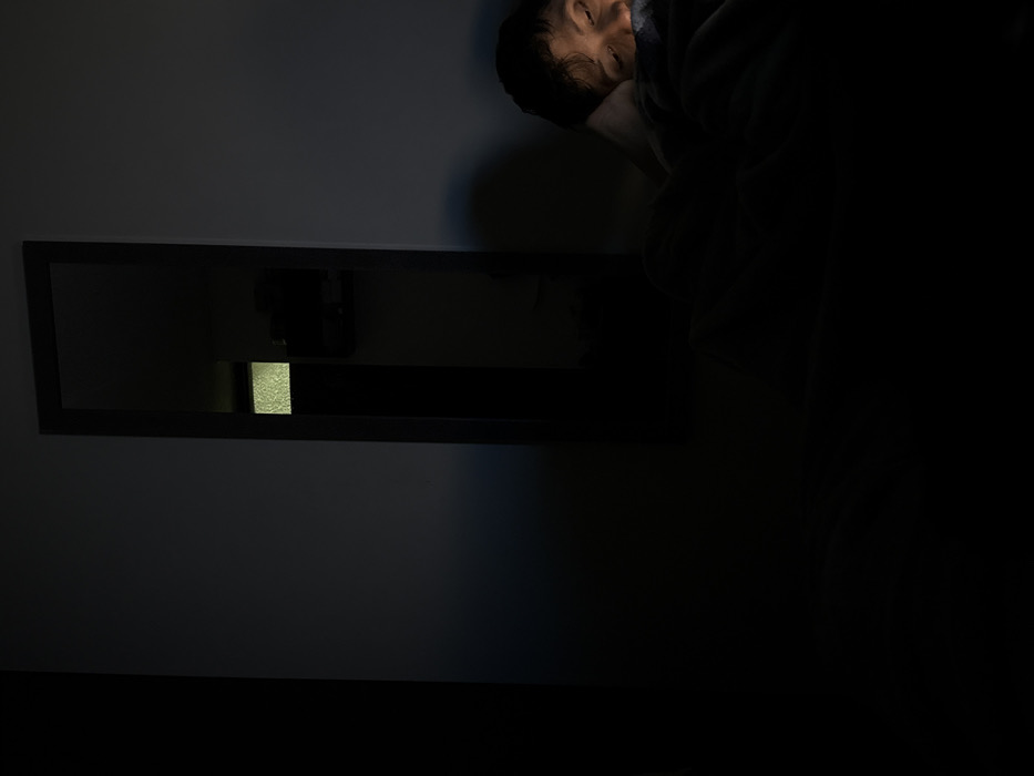 In a dimly lit setting, a man leans against a wall, his face partially illuminated. A rectangular mirror hangs on the wall, reflecting a faint, square light source within the room. The mirror's frame is dark, contrasting with the small patch of illumination. The surrounding wall is a flat, dark color. The majority of the image is shrouded in shadow, obscuring details.