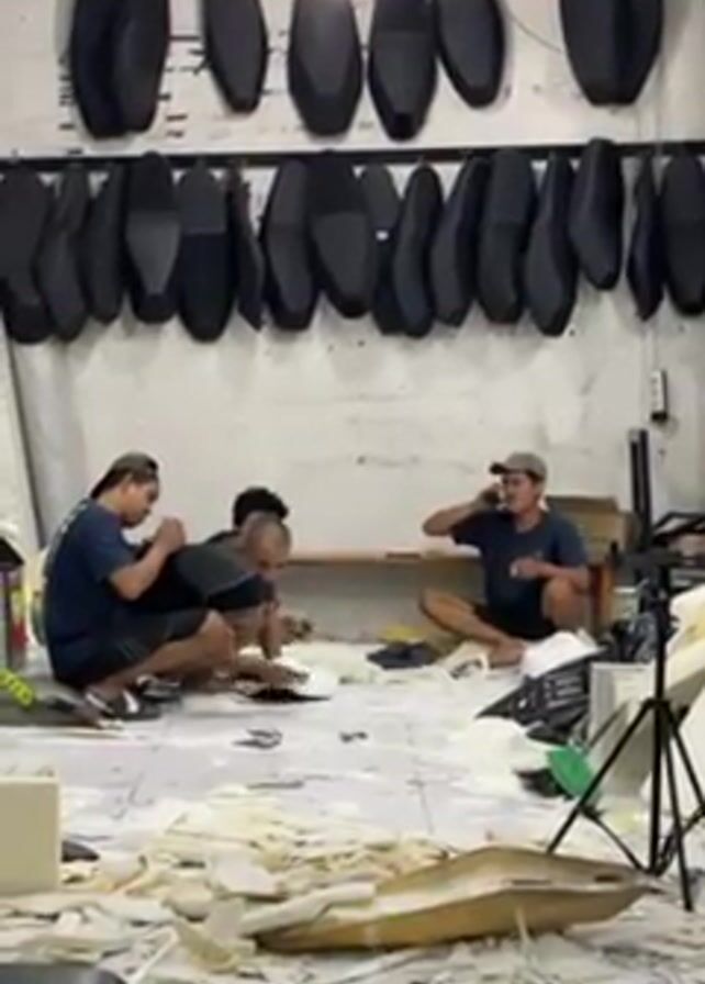 interior of what appears to be a workshop dedicated to crafting and customizing motorcycle seats. The room is visibly cluttered with scraps of foam and other materials scattered across the floor. Several people are present, some seated on the floor working on seats, while another stands and appears to be filming or speaking into a phone. Along the walls, numerous motorcycle seats, both in black and yellow colors, are hung for display or storage. Sewing machines are also present, indicating the fabrication aspect of the business. A framed picture is visible on the wall, adding a personal touch to the workshop environment. Overall, the scene depicts a busy, functional space where motorcycle seat customization and production take place.