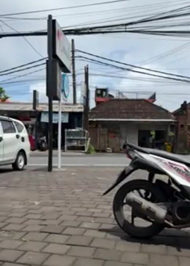 street scene in what appears to be a tropical location. A white van and a green truck pass on the road. A parked motorcycle is visible on the brick-paved sidewalk. A sign is also on the sidewalk. Buildings, including a small shop, are seen in the background. Power lines crisscross the sky. Two people ride on a motorcycle in the background. The sky is overcast.
