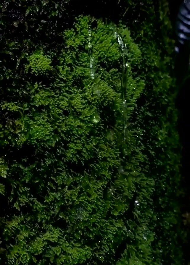 patch of lush, green moss. Water droplets are flowing down over the moss. The background is dark.