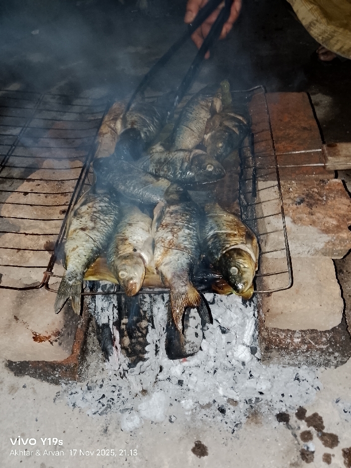 - "An overhead view captures the grilling of approximately ten whole fish on a metal grate over glowing charcoal and ash" by FM-bXIMf1, licensed under CC BY 4.0