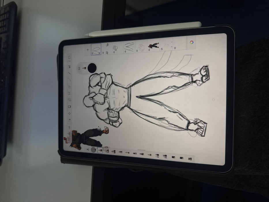 The image displays an iPad, oriented vertically, exhibiting a digital art application interface. The screen prominently features a monochrome line drawing of a muscular, bare-chested male figure in a fighting stance, depicted with loose-fitting pants and open-toed sandals. In the upper-left section of the screen, a smaller, colored reference image shows a dark-skinned character with red hair, dark attire, and sandals, posed similarly. The application's user interface elements are visible, including a toolbar with drawing tools on the left and layer/option panels on the right. A white Apple Pencil is magnetically attached to the right edge of the iPad. The device rests on a dark, textured fabric surface, presumed to be a person's lap or clothing. The background, out of focus, shows a light-colored desk or table surface and a dark electronic device, likely a keyboard. The location of this scene is Sofia, Bulgaria.