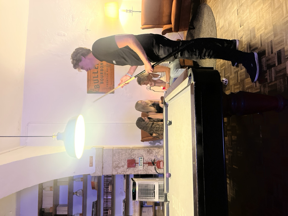 An indoor scene depicts a social gathering around a billiards table, likely in a lounge or common area