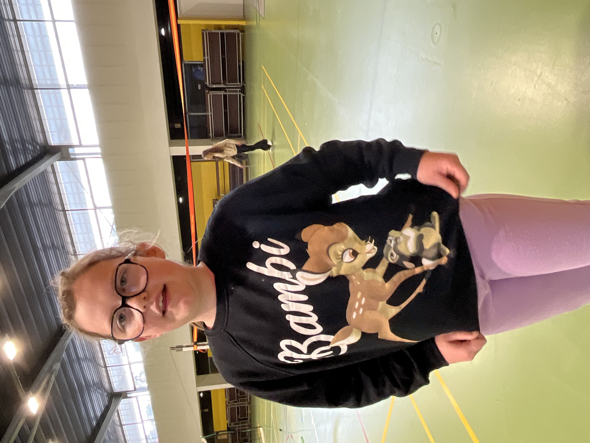 A woman with glasses is standing indoors in what appears to be a gymnasium or indoor sports facility. She is wearing a black sweatshirt with a "Bambi" design and light purple leggings. Behind her, the gymnasium has a green floor marked with yellow lines, a ceiling with industrial-style lighting, and a wall painted yellow and black in the background. In the background, someone walks across the gymnasium floor. The location is likely La Fouillouse, France, given the context.