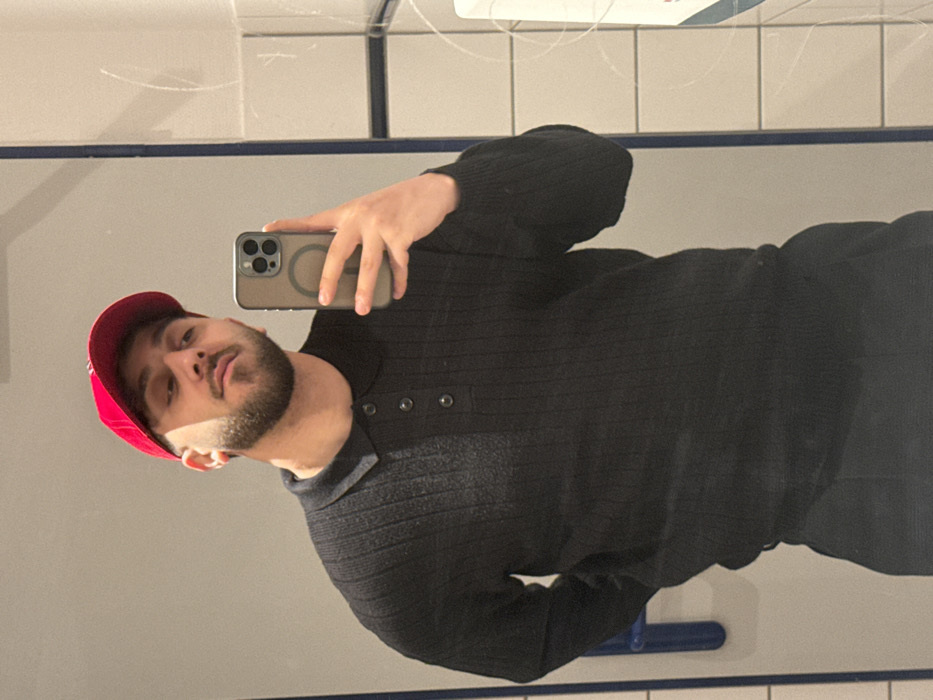 A man in a red baseball cap holds a smartphone in front of a mirror, taking a selfie. He has a beard and is wearing a black collared, long-sleeved shirt. The reflection shows tiled walls and a soap dispenser above him. He is looking into the camera with a serious expression.