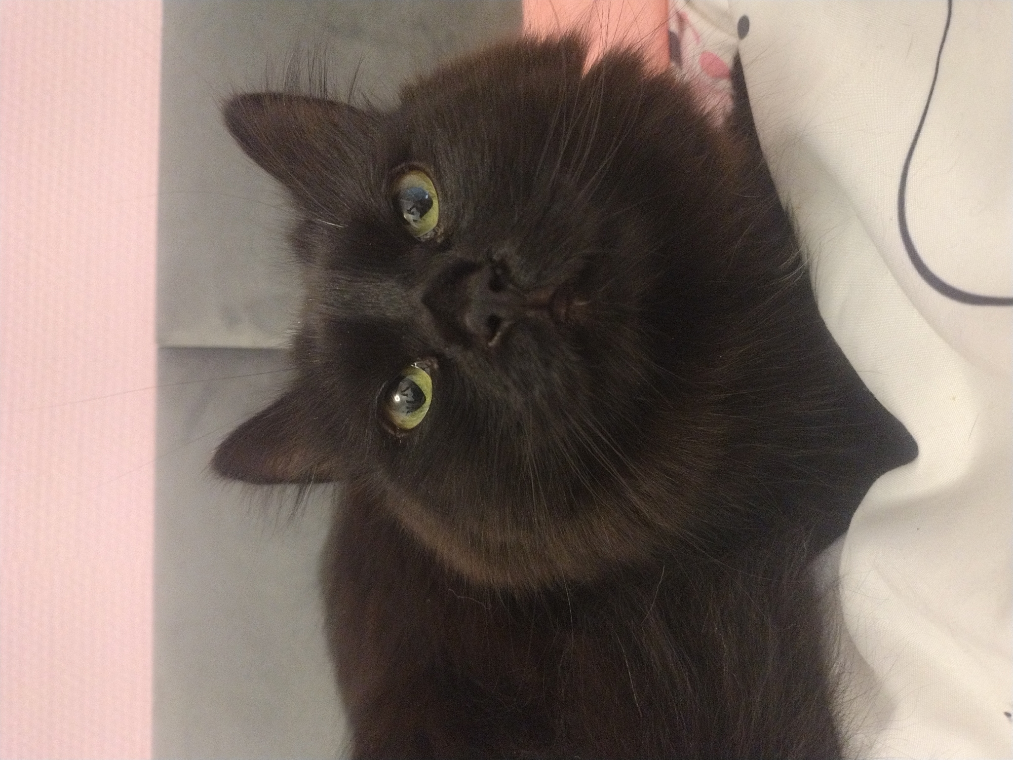 A black, long-haired cat with prominent green-yellow eyes is depicted in a medium close-up, gazing directly forward. Its dark fur shows hints of brown, particularly around its voluminous cheeks and chest, with numerous visible whiskers. The cat is situated on white bedding with a subtle black pattern visible on the lower right, implying an indoor setting. Behind the cat, a grey upholstered headboard or wall panel is visible, with a light pink wall section occupying the upper portion of the frame. There are no other individuals, objects, or actions evident. The specific location in Crauthem, Luxembourg, cannot be determined from the visual evidence provided.