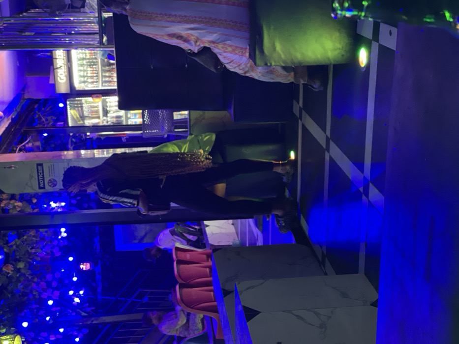 A nighttime indoor scene. A person with braided hair, wearing a black outfit with a white stripe, stands near a table. Behind, there's a cooler stocked with drinks, illuminated by blue lights. In the distance, a seated individual wears a patterned shirt. The ambiance is created by blue lighting and decorative floral arrangements, giving the space a lively and inviting feel. The area includes seating and patterned walls.