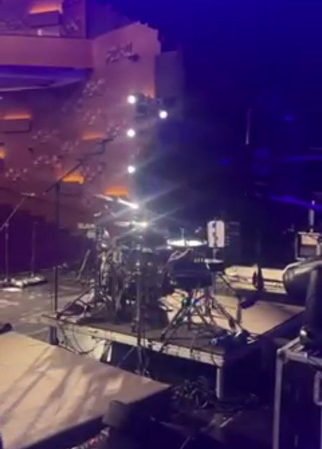 stage setup for a musical performance. A drum set is positioned on a raised platform, surrounded by various musical instruments and equipment including microphone stands and stage monitors. Bright stage lights obscure some details, but the scene suggests preparations for a concert or performance in a large indoor venue with auditorium seating.
