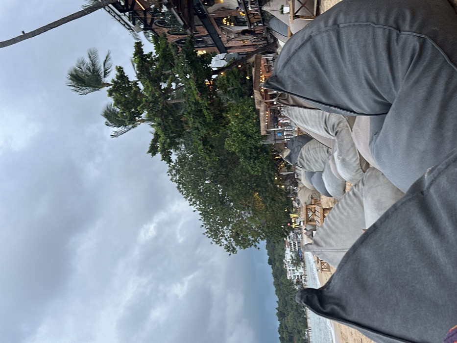 This image captures a beach scene in Baan Bo Phut, Thailand, under a uniformly grey, overcast sky, indicative of dusk or low light conditions. In the immediate foreground, a dark grey beanbag chair partially obstructs the view, with a dark-clad leg or foot resting upon it. Numerous other beanbag chairs, ranging in color from dark grey to light grey and beige, are arranged across the sandy beach, interspersed with small, light-colored wooden tables. In the midground, a thatched-roof structure, possibly a bar or restaurant stall, is illuminated by warm string lights, with several indistinct human figures visible near and around it. Behind this, lush green foliage, including tall palm trees with visible wind-swept fronds, lines the shore. To the right, a multi-story building with a brick-like facade and arched windows is visible, also lit with warm artificial lights. In the background, along the distant coastline on the left, several white-colored buildings are visible, backed by a tree-covered hillside. A pier or jetty extends into the water from this distant shore. The overall environment suggests a casual outdoor recreational or dining area.