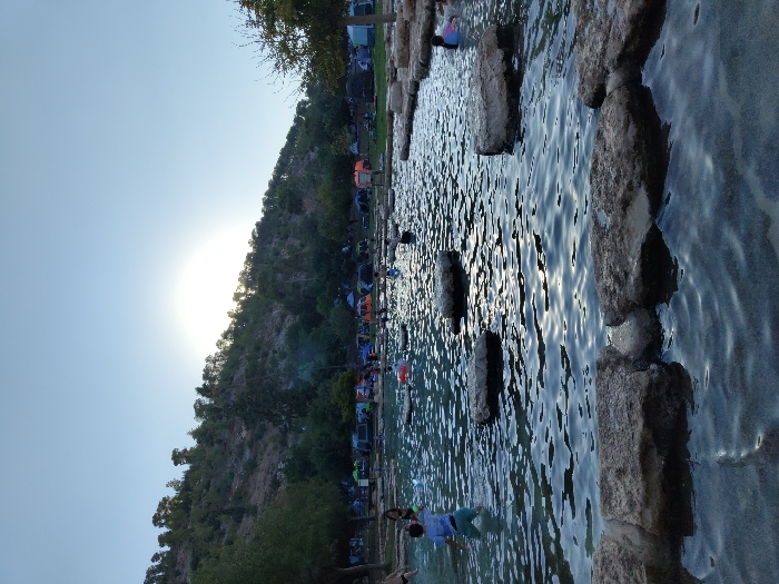 The image captures an outdoor recreational area, specifically Gan HaShlosha National Park (Sakhne) within the Gilboa Regional Council, Israel, during late afternoon or early evening