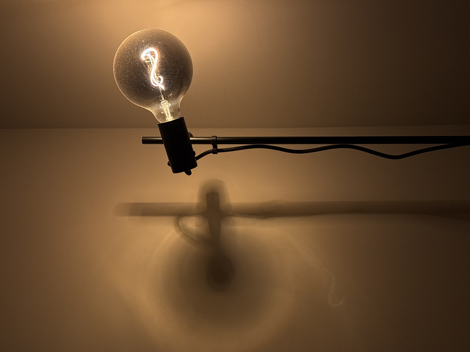 - "A glowing lightbulb, mounted on a black horizontal bar, casts a blurred shadow on the beige wall below" by FM-IT8bv2, licensed under CC BY 4.0