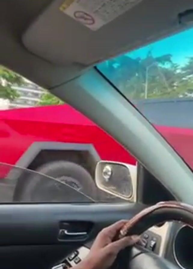 view from the driver's seat of a car. A person's hands are visible on the steering wheel. The car is moving, and a large red vehicle is alongside. Trees and a building can be seen through the windshield. The car has a brown wood-trimmed steering wheel and a black dashboard. The rearview mirror is visible. A warning label is affixed to the visor.