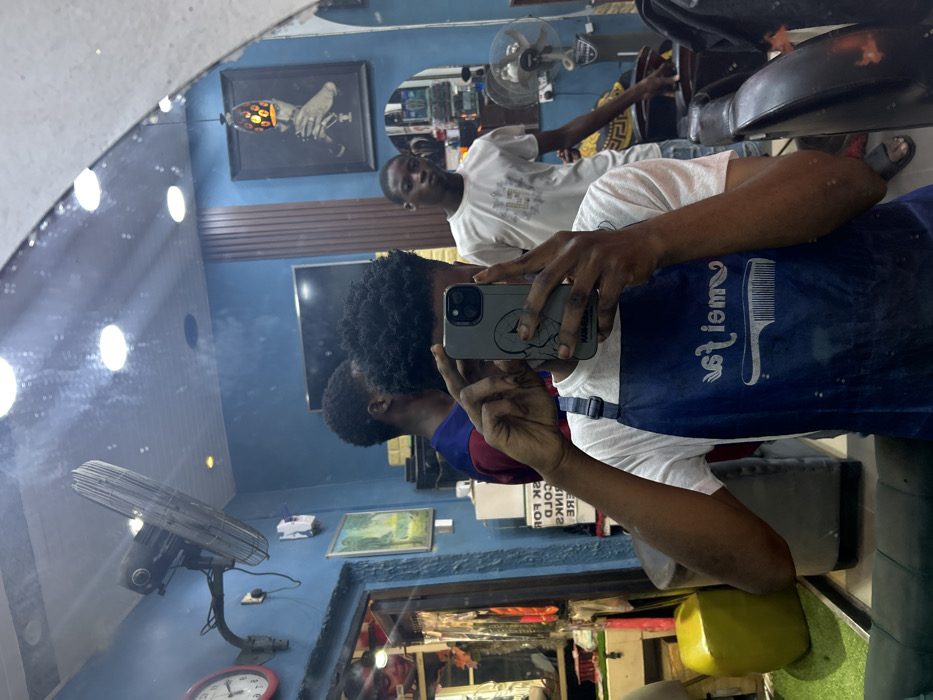 A selfie captured in a barber shop through a mirror