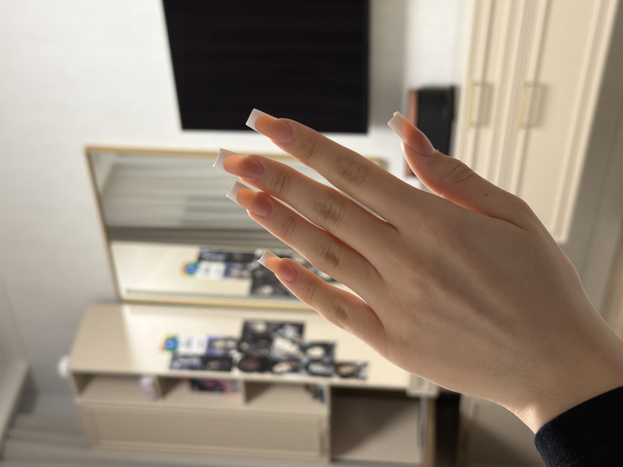 A human hand with long, square-shaped nails with a white tip design is the prominent subject. The hand is in focus, displaying the skin tone and fine details. The background consists of a domestic interior, including a TV screen, a dressing table or vanity unit cluttered with items, a mirror, and a wardrobe. The location is likely inside a home, but not identifiable to Nizhnevartovsk. There are no discernible people other than the person whose hand is shown. No actions or interactions are explicitly visible. The environment is generally well-lit.