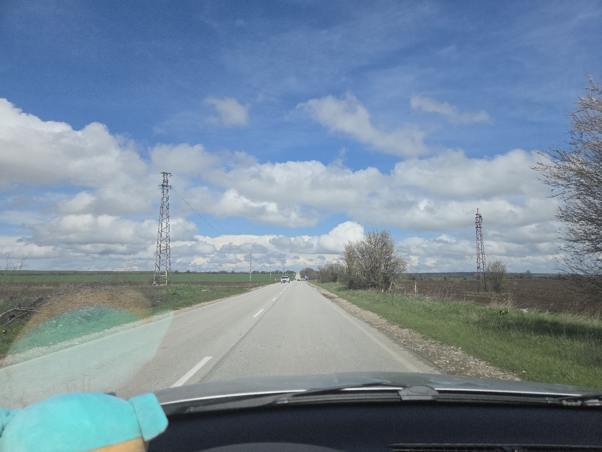 The scene depicts a forward-facing view from within a vehicle, looking out through the windshield onto a two-lane paved road in Patresh, Bulgaria. The asphalt road features a solid white line on its left edge and a broken white center line extending into the distance, where multiple vehicles, including a white sedan, are observed traveling in the same direction. The immediate road shoulders are composed of dirt, transitioning into strips of green grass. Beyond the grass, cultivated agricultural fields, some tilled brown and some showing nascent green growth, stretch towards the horizon on both sides. On the left side of the road, a metal lattice-style electricity transmission tower stands within a field. Further down the road on the left, a utility pole is visible. On the right side, a similar electricity transmission tower is present, partially obscured by a line of leafless deciduous trees and shrubs bordering the road. A blue road sign is partially discernible on the distant right shoulder. The sky is bright blue and clear, populated by numerous scattered white cumulus clouds. A multi-colored light refraction, consistent with a partial rainbow, is visible on the lower-left area of the windshield. A light blue, plush object is partially visible on the vehicle's dashboard in the lower-left foreground. No individuals are present in the frame.