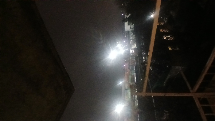A nighttime scene shows bright lights shining on a street. The view appears to be from a porch or elevated area. A dark, possibly wet surface is in the foreground left. A structure of thin supports is on the right. The street features illuminated buildings and objects, potentially from vehicles. The sky above the street is dark and cloudy.