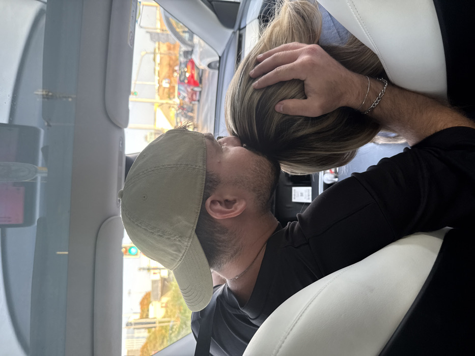 The scene depicts two individuals inside a vehicle, parked at an intersection in Bnei Brak, Israel. A male, visible from the chest up, is positioned on the left side of the frame, wearing a dark long-sleeved shirt and an olive-green baseball cap. He has short facial hair and a thin silver chain necklace. He is leaning forward, kissing the top of the head of a female individual, whose blonde hair is visible on the right. His left hand is placed on her head, while his right arm, adorned with two silver bracelets (one chain link, one thin band), is also visible. The vehicle's interior features light-colored seats. Through the front windshield, a green traffic light is visible, along with multiple vehicles on the road, including a red car, and distant city buildings with some vegetation. A red reflection is present in the vehicle's rearview mirror.