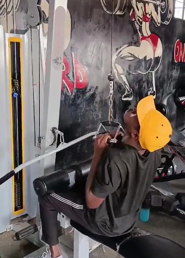 A man in a yellow cap is performing seated cable crunches in a gym. He's sitting on a black bench with leg support pads, pulling down on a cable attached to a weight stack machine. The gym has weightlifting-themed murals on the wall, and exercise equipment is visible in the background.