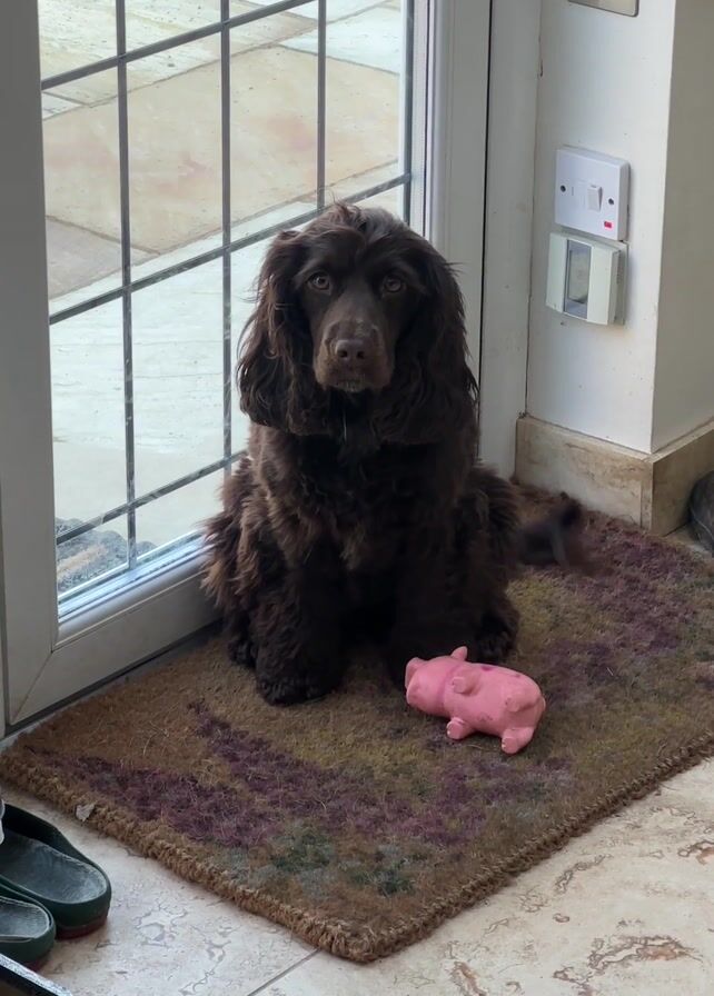 A brown Cocker Spaniel sits on a doormat, indoors. The doormat is a brown and purple floral pattern. Next to the dog is a small pink pig toy. The dog is sitting near a door with a grid pattern in the glass. There are light switches visible on the wall next to the door. A wooden crate and shoes are visible in the lower left corner of the frame. The floor is tiled. The dog stares directly at the camera.