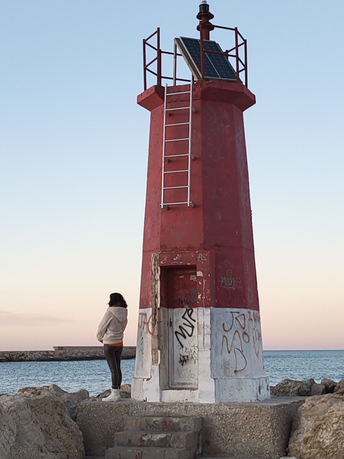 A waist-up view shows a person with medium-length dark hair stands with their back to the viewer. They are wearing a light-colored hooded sweatshirt, a brown top, black pants, and white boots. They are standing on grey stone steps at the base of a red and white lighthouse. The lighthouse has graffiti on its lower white section. Above the red tower section is a ladder and a black solar panel at the top. Behind the person and the lighthouse, there is a calm blue sea, a long breakwater, and a clear, light blue and pink sky. The photograph was taken at the far eastern end of the Dénia harbour in the city of Dénia, Spain.