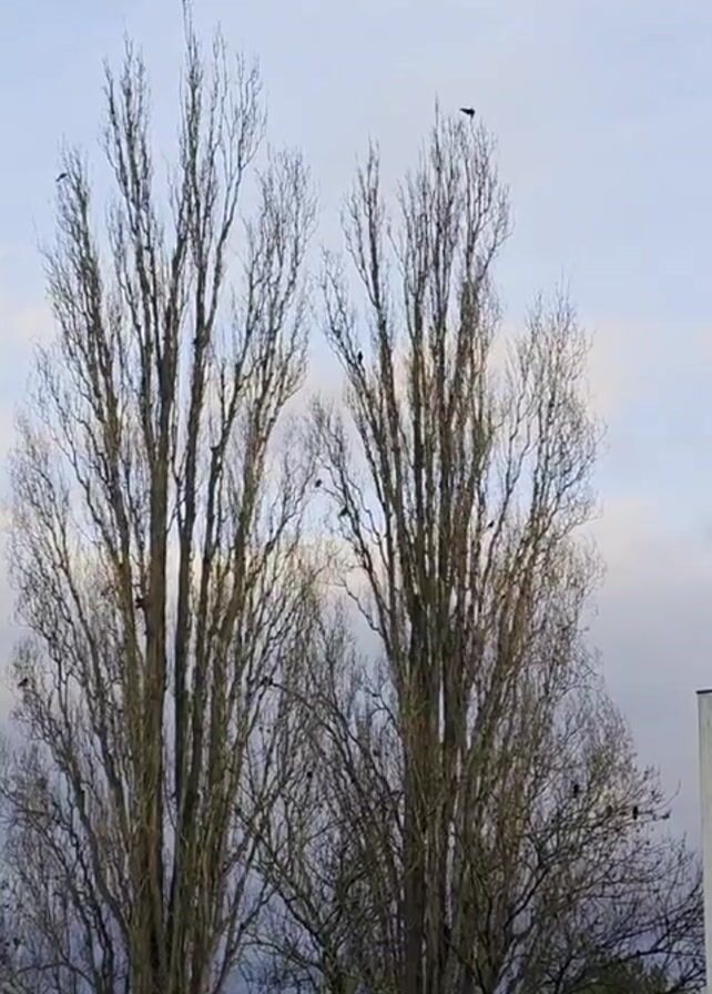 two tall, bare trees against a cloudy sky. Several black birds are perched in the branches of both trees. Some greenery is visible at the bottom of the frame, and a white building is visible to the right.