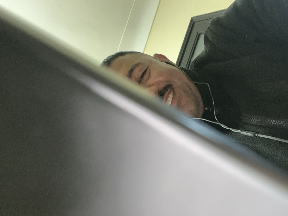 A man peers from behind a large, blurred gray object, presumably a computer screen. He smiles, revealing white teeth, and wears earbuds connected by a white cord. The man has dark hair, a mustache, and a dark jacket. A doorway is visible in the background against a light yellow wall. The angle suggests the image was taken from a low perspective, looking upward.