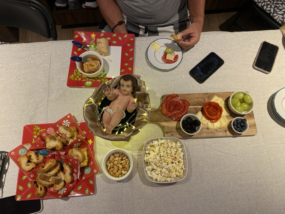 A table laden with snacks includes bread on a holiday plate, nuts, popcorn, a charcuterie board with meats, cheese, olives, grapes, and blueberries. There's also a dish with what appears to be cabbage rolls and a small plate with cheese, salami, and grapes. A statue of baby Jesus sits in a bowl with fairy lights. Two smartphones are on the table. A person's hands are visible, one holding a snack.