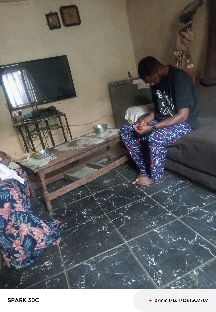 The scene depicts an indoor domestic environment, likely a living room, in Unknown, Unknown. An adult male with dark complexion and short hair is seated barefoot on a dark grey upholstered sofa, gazing downwards with his hands interlocked or holding a small object. He wears a black t-shirt with a light design and blue pants patterned with white and red text. A white fabric item is draped over the sofa armrest behind him. To the left, a partially visible individual wears a blue and pink floral patterned garment, seated on an unseen surface. Between the two subjects is a distressed rectangular wooden coffee table with a lower shelf, holding two small metal bowls on its surface. In the background, a black flat-screen television is positioned on a black metal tiered stand. The stand holds a power strip with connected cables and a blue container. Above the television, two framed items, one rectangular picture and one square object (possibly a clock or another frame), are mounted on the light-colored wall, which shows some discoloration. A silver-grey cabinet or appliance is visible to the right of the TV stand, behind the male subject. The floor is covered with black square tiles featuring white marbling.