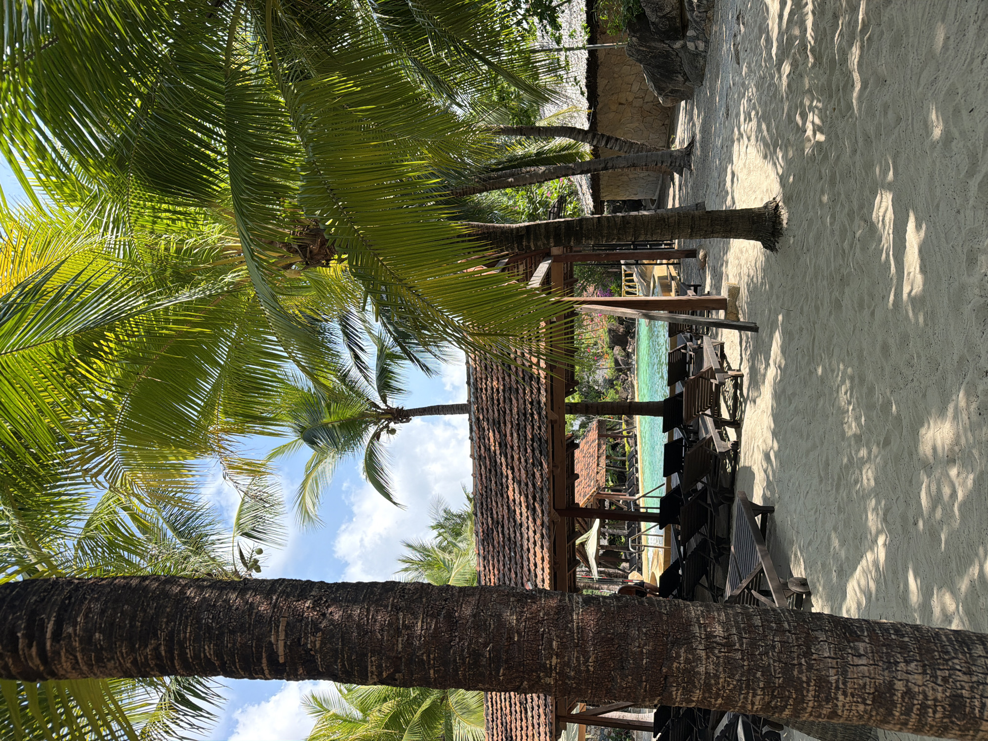 beach scene at a resort in Tây Nha Trang, Vietnam. Tall coconut palm trees frame the view. The foreground features a close-up of a textured palm tree trunk, while other palms line the beach. Between the trees, there's a glimpse of a building with a tiled roof and an open-air structure with wooden furniture, including chairs and tables. Beyond the structure is clear turquoise water. The beach is sandy with shadows cast by the trees. The sky is visible through the leaves, with patches of blue and white clouds.