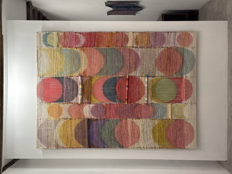 The image displays a large, rectangular woven textile artwork mounted centrally on a white wall within an indoor art exhibition space, likely located in Paris, France, given the visible exposed dark wooden ceiling beams characteristic of historic Parisian architecture. The prominent artwork features a complex pattern of numerous interconnected circles of varying sizes and colors, including shades of red, pink, orange, yellow, green, purple, and blue, against a lighter, interwoven background. Several cylindrical elements, appearing as horizontal rolls of coiled fabric, are integrated into the weaving, particularly down the central vertical axis. The floor is light grey. To the right of the main artwork, a secondary, smaller dark blue textile piece, exhibiting draped folds, is mounted on another white wall, with a dark wooden or metal console table positioned beneath it. The scene is devoid of people.