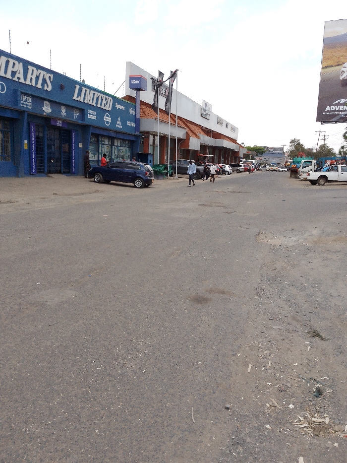 The image depicts a commercial street scene on Kenyatta Avenue in Nakuru, Kenya, under an overcast sky
