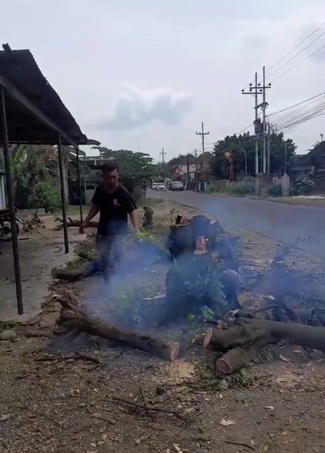Two men are clearing logs and branches near a road. Smoke rises from the pile of debris. One man walks around the debris. The other is crouched, working on the pile. A covered area is visible on the left side of the frame. A road with passing vehicles is visible in the background. Power lines and houses are also visible. The weather is overcast.