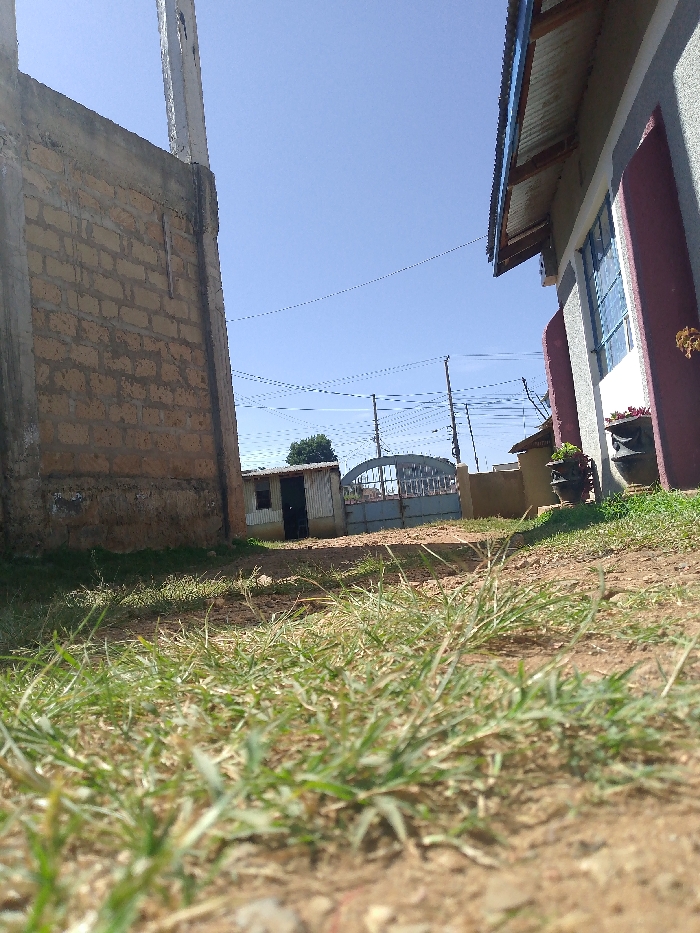 A low-angle shot depicts a grassy path between two buildings. A brick wall stands to the left, while a structure with a visible roof edge, window, and wall decorations occupies the right. In the distance, a small shed and metal gate are visible under a clear sky with power lines. The ground is covered in green grass and dirt.