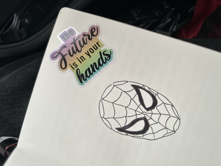 An open white notebook rests on a dark fabric surface, likely a person's leg or lap, in an interior setting located in Trilistnik, Bulgaria. On the notebook's left page, a black ink drawing of Spider-Man's masked face is visible, featuring a web pattern and prominent, solid black eye areas. On the upper right page, an iridescent sticker is affixed, displaying the phrase "the Future is in your hands" in stylized, multi-colored script. The surrounding background consists of dark clothing fabric along the left and top edges, while the right and bottom edges show dark, possibly automotive interior material, with a small patch of red fabric at the lower right corner. No individuals are explicitly visible in the scene.